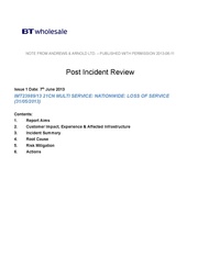 | 13:41, 11 June 2013 | IMT23989.pdf (file) | 116 KB | AA-Andrew (talk | contribs) | BT Post Incident Review Issue 1 Date: 7th June 2013 IMT23989/13 21CN MULTI SERVICE: NATIONWIDE: LOSS OF SERVICE (31/05/2013) At 16:20 on the 31st May, Loss of management alarms were presented against the core router at Stepney and IMT23970/13 was rais... | 1 | |