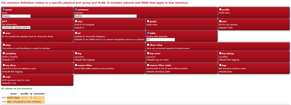 - Connected the Starlink via a new Port and Interface with a Routing table of 10, instead of the default normal internet connection of ‘0’.