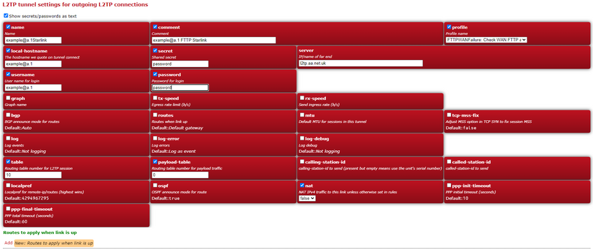 - Created a L2TP connection to connect to AAISP, over Starlink, using (in this case) it’s routing table of ‘10’, sending traffic from the default payload table of ‘0’ on the Firebrick, logging into the AAISP servers with our normal Internet service credentials.
